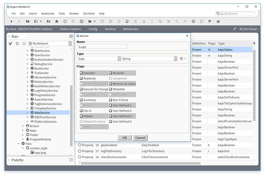 logo. This is important – it must be called logo or Niagara will not know this is your custom logo slot. Verify that the Type dropdowns are set to baja and String. Then click the OK button.