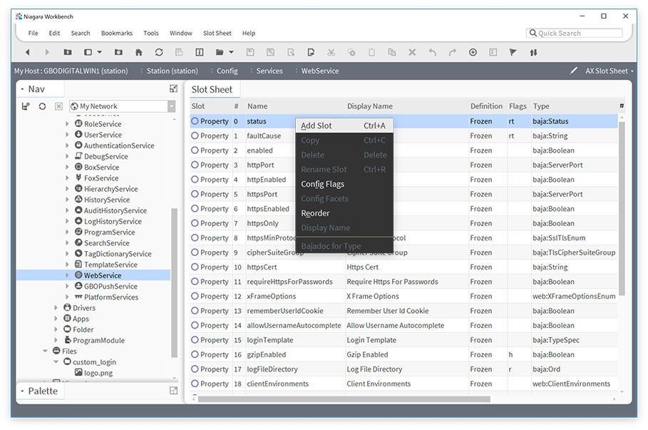 - In your station's Nav Tree, navigate to Config > Services. In the list of services find the WebService and right click on it and a menu will appear. Go to Views > AX Slot Sheet. You should see a table of slots load on the right.