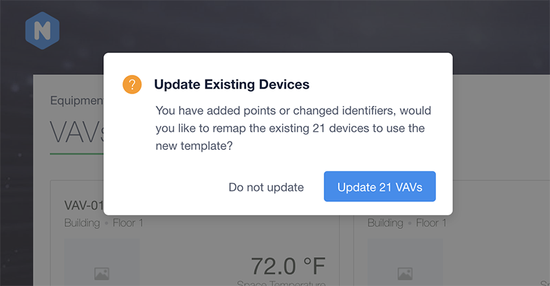 The lack of connectivity between the two is why, if you make changes to a Points Template, you will get prompted with an alert asking if you want to remap existing devices to new version of the template.